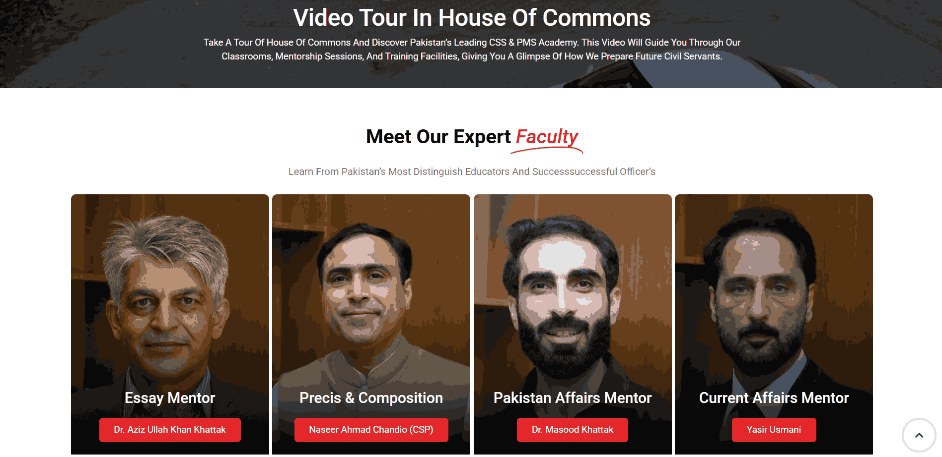 The academy’s faculty includes notable mentors: Manahil Haroon (General Science & Ability), Naseer Ahmad Chandio a serving CSP officer (Précis & Composition), Dr. Aziz Ullah Khan Khattak (Essay), Faisal Jahan Yousafzai (Pakistan Affairs), and Yasir Usmani (Islamic Studies) among others all of whom needed to be professionally presented on the website.