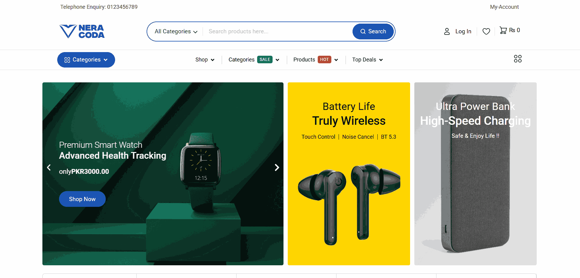 Neracoda is a Pakistan-based mobile accessories e-commerce store built on WooCommerce and designed with Elementor. The store offers a comprehensive range of tech accessories spanning 10 main categories Smart Watches, Mobile Phones, Bluetooth Headsets, Charging Cables, Fast Chargers, Power Banks, Wireless Earbuds, Neckband Handsfree, Mobile Accessories, and Adapters & Converters.