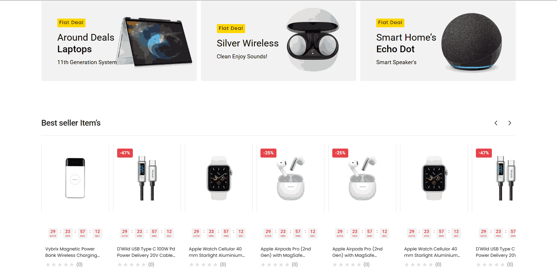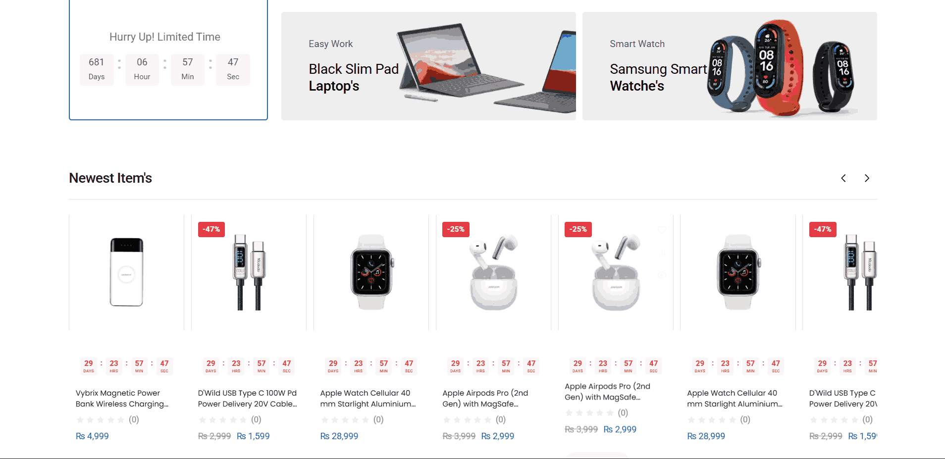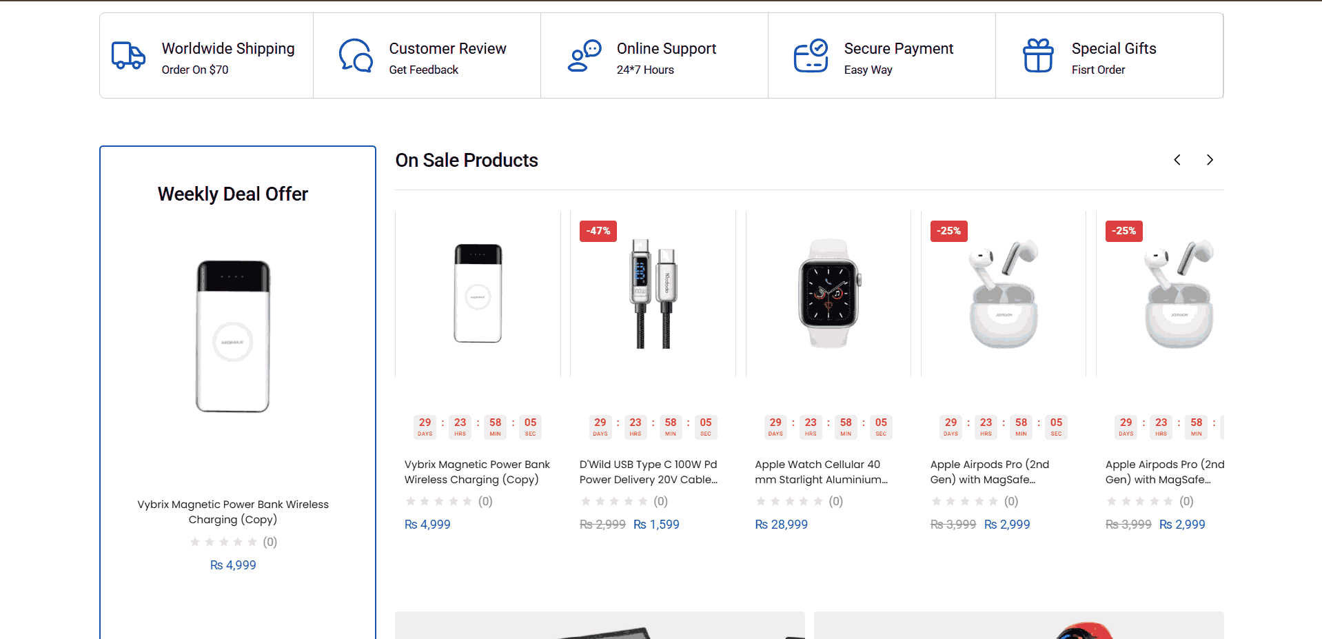 Surlavish built the complete store from scratch designing the homepage, mega navigation menu, product category structure, and all supporting pages including Shop, New Arrivals, Best Sellers, About Us, Contact, and FAQs. The store carries top products including Apple Watch Cellular, Apple AirPods Pro 2nd Gen, Vybrix Magnetic Wireless Power Bank, and D’Wild 100W USB Type-C PD cables with PKR pricing throughout.